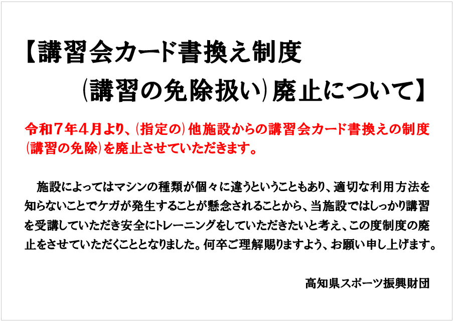 2025年1月29日 / 最終更新日時 : 2025年1月29日 haruno お知らせ トレーニング室利用講習会免除制度の廃止について 春野総合運動公園では、特定施設のトレーニング講習会を受講済みの方に対して、春野の講習会を免除としておりましたが、令和7年4月からその制度を廃止いたしますのでお知らせいたします。