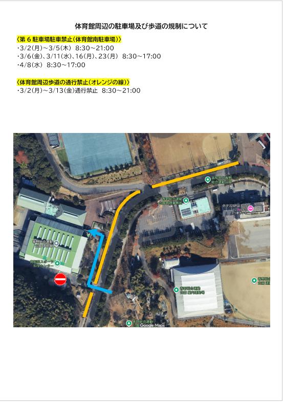 2026年2月25日 / 最終更新日時 : 2026年2月25日 haruno お知らせ 工事に伴う体育館周辺の駐車場及び歩道の規制について 体育館屋根工事及び歩道の舗装工事に伴い、下記の通り駐車場及び歩道の規制がかかります。 利用者の皆さまにはご迷惑をお掛けいたしますが、ご理解ご協力のほどよろしくお願いいたします。