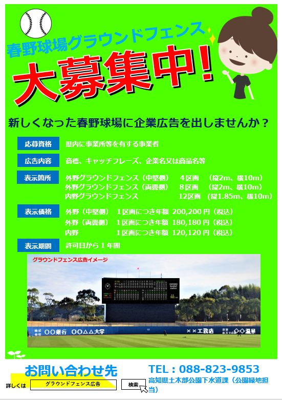 2020年5月6日 / 最終更新日時 : 2020年5月16日 tsushin お知らせ 野球場グラウンドフェンスへの企業広告掲載について 春野総合運動公園野球場では、グラウンドフェンスへの企業広告を募集しています。この機会にぜひご活用下さい。