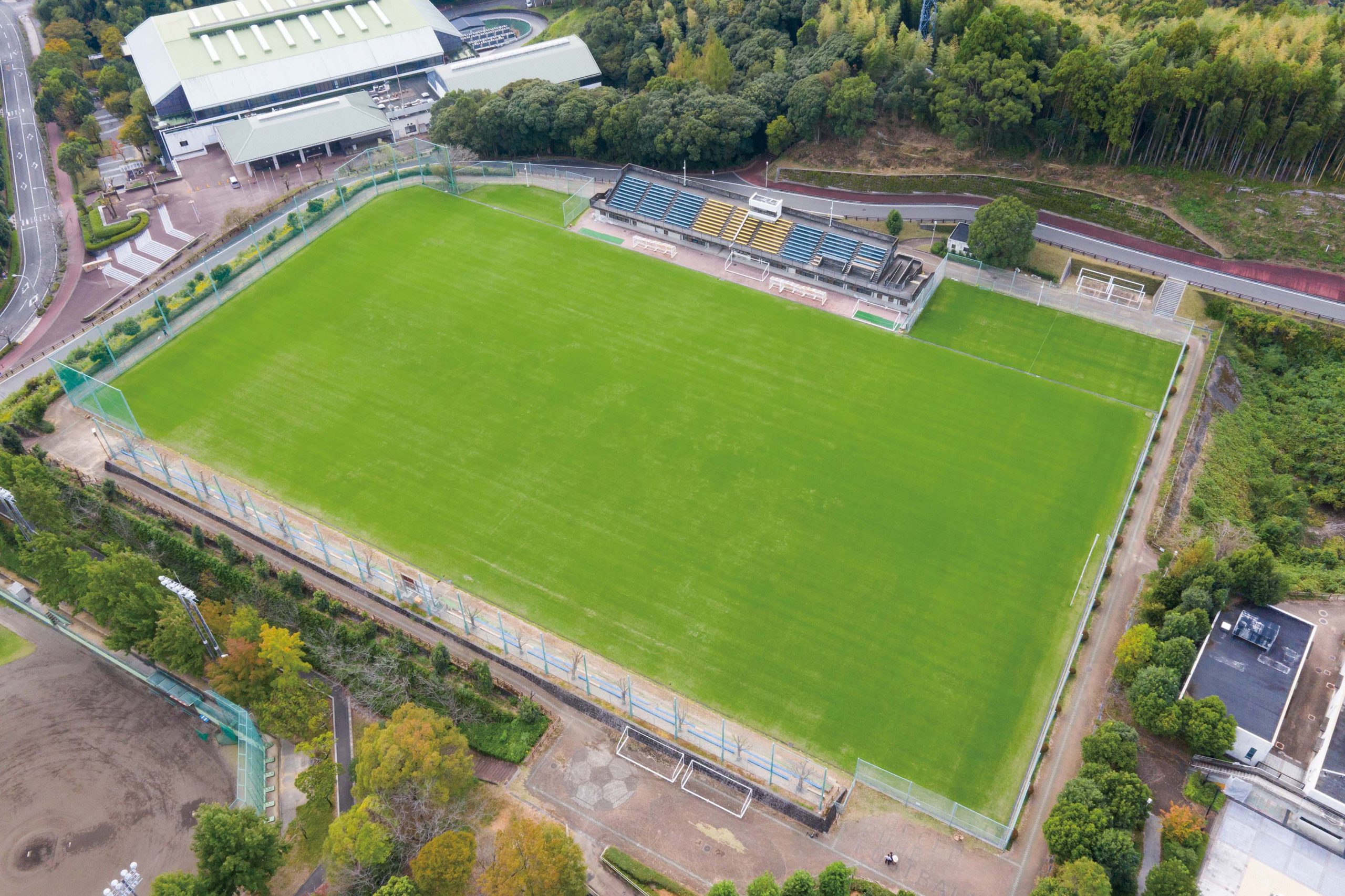 Jリーグのキャンプや実業団ラグビーチームの合宿などを行っている本施設は、敷地面積が通常のサッカー場の1.5倍もあり、全国大会をはじめ国際大会も実施可能な設備を備えています。また、芝の切換えを行うことで、一年中緑のきれいな状態を保っています。